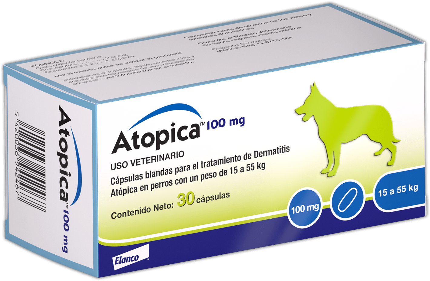 Indicaciones y especies de destino: Perro: Tratamiento de la dermatitis atópica crónica. Atopica® 25 mg: Perros de 4 a 7,5 kg. Atopica® 50 mg: Perros de 7,5 a 36 kg. Atopica® 100 mg: Perros de 15 a 55 kg.